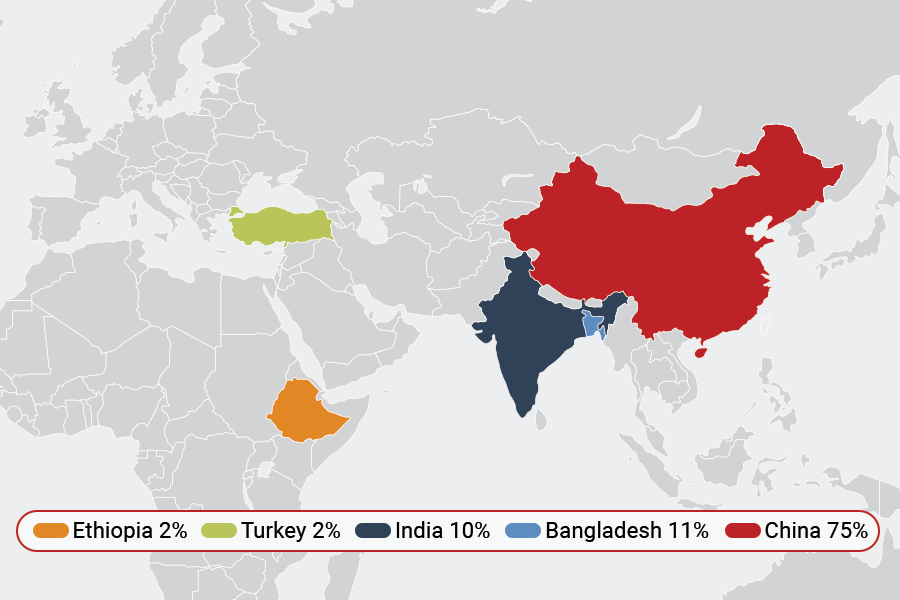 Production for Beconnected/Erve Group takes place in China (75%), Bangladesh (11%), India (10%), Turkey (2%) and Ethiopia (2%). We have examined each country individually to understand the risks to people and the environment. A risk analysis has been conducted based on nine themes as set by the Dutch Agreement. The risks are indicated with a letter, similar to BSCI ratings, where A is very low risk and E is very high risk.