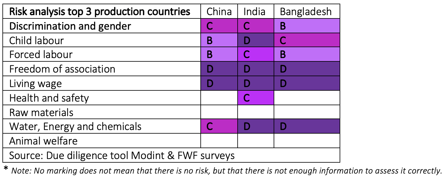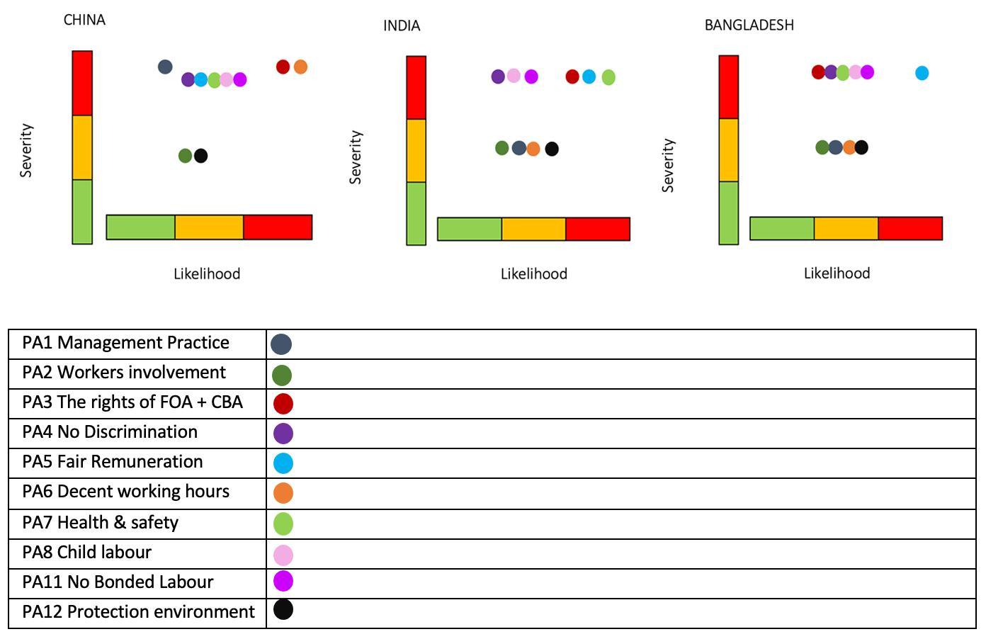 The below matrixes show the most serious and most probable risks in our chain per country. This is a combination of country risks and risks that have emerged from the social audit reports. We have verified our conclusions with stakeholders and adjusted them where necessary. The analysis has been assessed by stakeholders such as CNV, FNV, Arisa, Solidaridad and Modint.